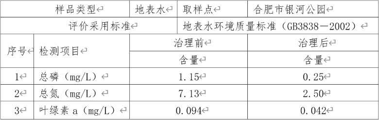 治理前,每年夏天开始,5-10月份银河公园蓝藻大面积爆发,水面上漂浮大量蓝藻,水体发腥、发臭。经治理后,蓝藻污染程度大大降低,没有形成大规模的蓝藻爆发情况,水体自净能力提升,透明度大幅提高,由之前的20几公分,提高到70公分,没有出现发腥、发臭的现象,水体氮磷等富营养物质含量也大大降低。