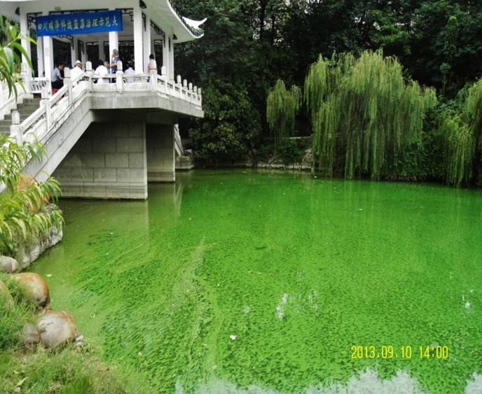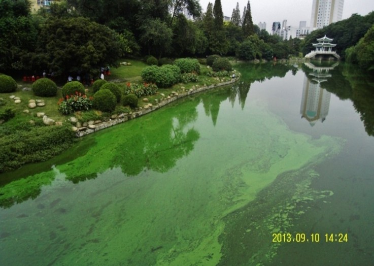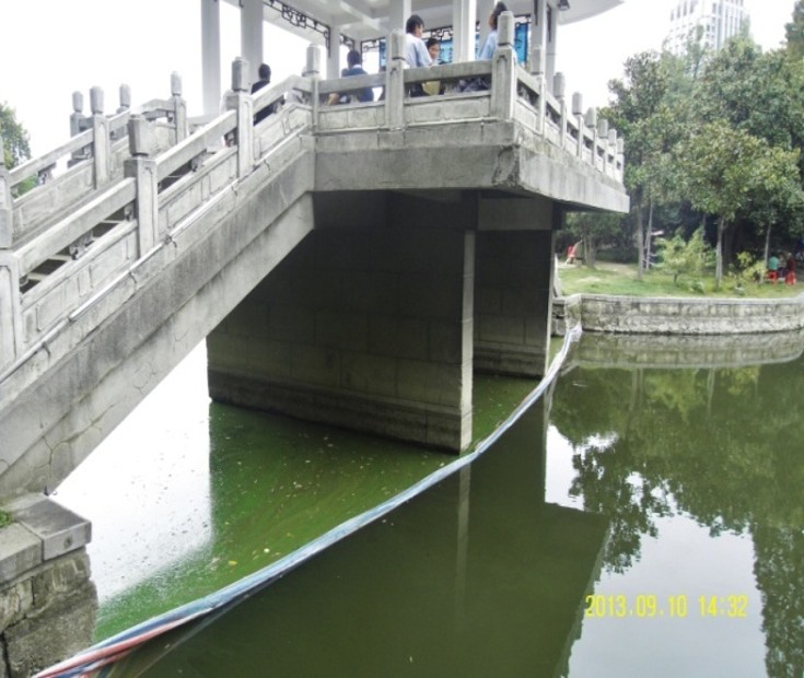 合肥市银河公园景区作为“国家级重点公园”—合肥市环城公园重要组成部分,位于合肥市南一环路中段附近,水面面积70余亩,水量20余万方。近年来,银河公园景区蓝藻爆发最为严重,有些地方已到了发臭的地步,环城公园管理处等有关部门也采取了很多积极的办法来解决蓝藻问题,再经复合硅酸铝水处理技术治理前,由于其他手段不能达到效果,也只采取浮泵抽排等简单方法处理,无法从根本上解决蓝藻污染的问题。