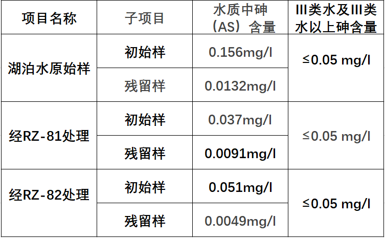 2009年10月10日,先对原始水样进行了监测,(见表1)测得原水样的砷含量为0.156mg/l,然后分别加入“阿尔益”治污类活性剂RZ-81、RZ-82对湖泊水样进行处理。10月27日,抽样进行数据监测,经RZ-81处理过的水样砷含量0.037mg/l;经RZ-82处理过的水样砷含量0.051mg/l。对照原始水样来看,湖泊水中砷的含量经处理后大幅下降。11月19日,技术人员又对水样处理后所剩物质进行监测处理,原始样的砷含量仍然在0.1mg/l以上。经活性剂(RZ-81、82)处理后的残留物中的砷含量只有微量存在,初期实验基本达到国家Ⅲ类水标准值,体现了“阿尔益”治污类活性剂的治污效果。