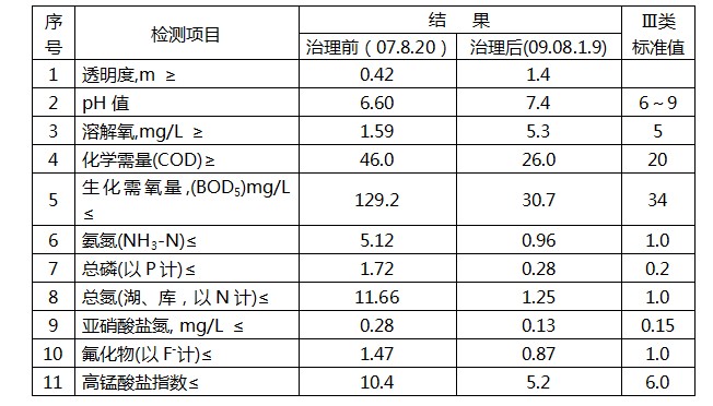 2、二十天观察后,水面蓝藻已基本消除,水色较原先池水有明显的改观,水体的透明度也较初期提高1.4米。