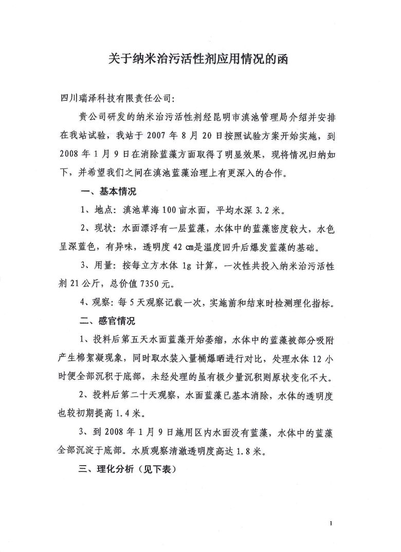 在试验期间,管理站的科研人员对草海的污染水体进行了取样分析,同时取水装入量桶爆晒进行对比,经过处理后的水体12小时蓝藻及污染物质便全部沉积于底部,水质清新透明度好,未经处理的水体虽有极少量沉积但水色变化不大,透明度低,感官效果差。