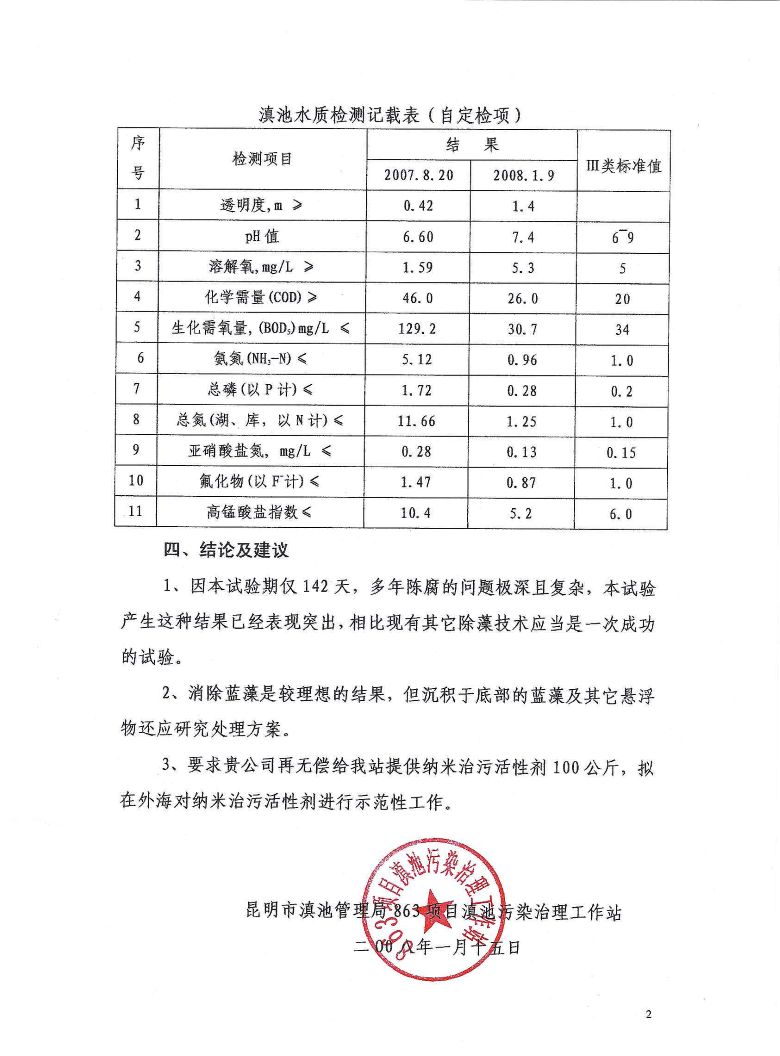 3、至2008年1月9日期间施用区内水面没有再产生蓝藻,大面积水体中的蓝藻全部絮凝沉淀于草海底部。水质良好,海水清澈,感官效果佳,透明度高达1.8米。
