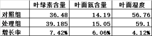 通过检测,实验组叶绿素含量、叶面氮含量、叶面湿度均高于对照组